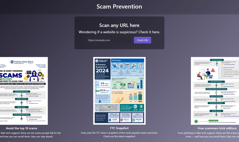 A simple, user-friendly web app that lets users check URLs for potential scams. Built entirely with HTML, CSS, and JavaScript, it highlights my skills in creating interactive, responsive, and accessible web interfaces.